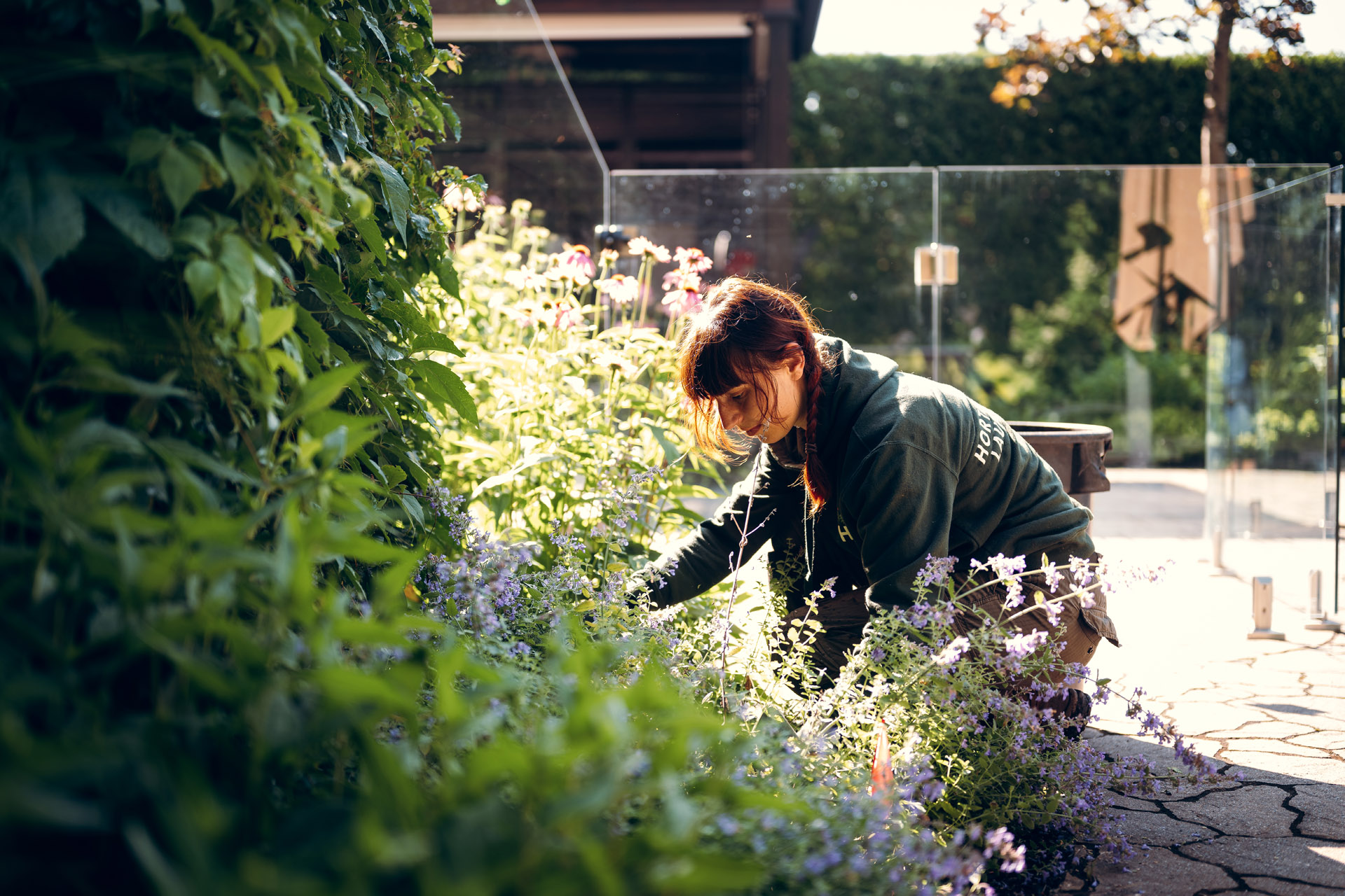 - À chaque visite, nous effectuons un désherbage manuel avec extraction complète des racines afin de limiter la repousse et l’ensemencement. Les vivaces qui ont tendance à se propager rapidement sont contenues par taille sélective afin de préserver l’équilibre des plantations. La division des végétaux matures n’est pas incluse au programme régulier et peut être planifiée séparément lorsque nécessaire.